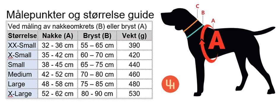 Dimensjonering: Hvis hundens halsomkrets er på grensen mellom to størrelser, anbefales det å velge den mindre størrelsen.
